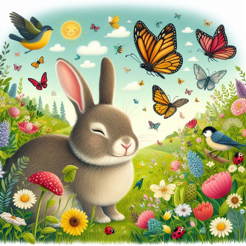 Bunny Rabbit also loved playing with his friends: the fluttering butterflies with shimmering wings, the cheerful ladybugs with black-peppered red shells, and the slow, buzzing bumblebees, turning the meadow into a magical playground of swirling motion, color, and sound. He often joined the chorus of birds in the air, their avian melodies blending with his into a glorious symphony of joy.